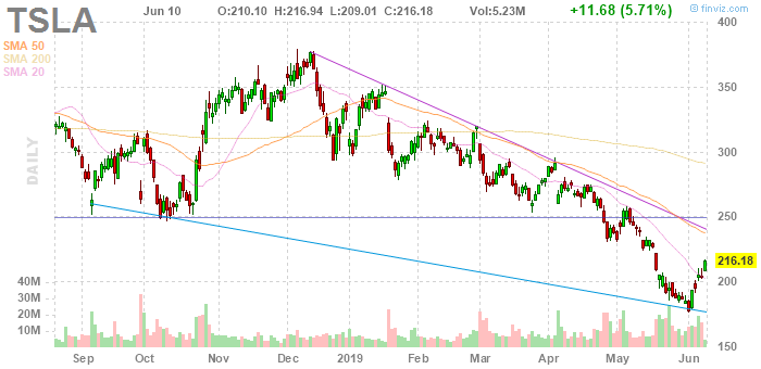 На текущий момент акции Tesla (TSLA) котируются по $216.18 (+5.71%).