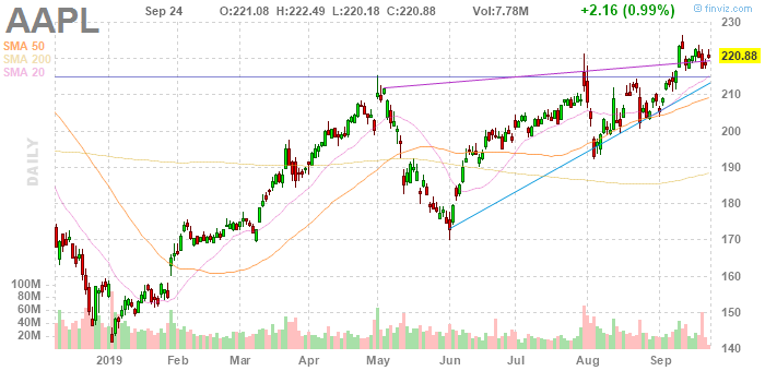 На текущий момент акции AAPL котируются по $220.88 (+0.99%).