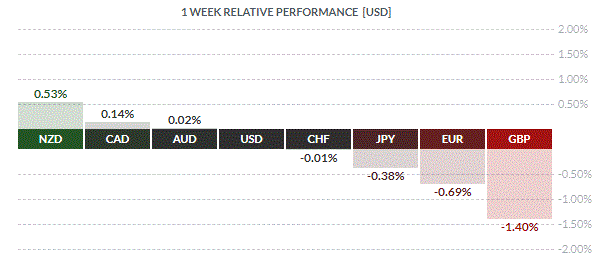 По итогам недели большинство основных валют продемонстрировали снижение. Наибольший спад по отношению к доллару США показал британский фунт (-1,40%). Меньшее падение зафиксировали евро (-0,69%), японская иена (-0,38%) и швейцарский франк (-0,01%). Повышение показали новозеландский доллар (+0,53%), канадский доллар (+0,14%) и австралийский доллар (+0,02%),