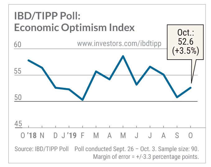 Данные показали, что индекс экономического оптимизма в США, рассчитываемый газетой Investor's Business Daily и исследовательской фирмой TechnoMetrica Institute of Policy and Politics, умеренно вырос в начале октября после того, как резко снизился месяцем ранее. Индекс поднялся до 52,6 пункта с 50,8 пункта в сентябре. Эксперты ожидали, что индекс вырастет лишь до 51,2 пункта. Напомним, значение индекса выше 50 пунктов указывает на оптимизм. Стоит подчеркнуть, что индекс находится выше уровня 50 пунктов уже 37 месяц подряд (с октября 2016 года), что является самой длительной серией за всю историю данного исследования, то есть более чем за десятилетие. Вместе с тем, индекс сейчас находится на 4 пункта выше своего долгосрочного среднего значения и на 9 пунктов выше показателя декабря 2007 года, когда экономика вступила в рецессию.
