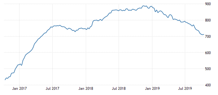 Отчет нефтесервисной компании Baker Hughes показал: с 5 по 11 октября количество активных буровых установок по добыче нефти в США выросло на 2 единицы, и составило 712 единиц. Это было первое повышение за последние 8 недель. Напомним, годом ранее количество установок составляло 869 штук. Количество установок по добыче газа уменьшилось на 1 штуку, до 143 единиц. Общее число буровых установок (газовых, нефтяных и прочих) выросло на 1 штуку, составив 856 штук.
