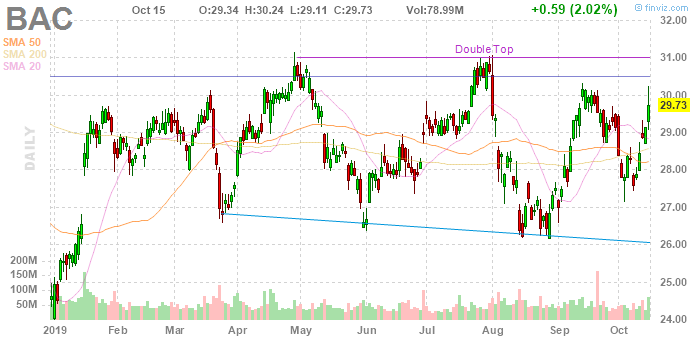 Согласно обнародованному отчету, прибыль компании Bank of America (BAC) по итогам третьего квартала 2019 финансового года (ФГ) достигла $0.75 в расчете на одну акцию (против $0.66 в третьем квартале 2018 ФГ), что оказалось выше среднего прогноза аналитиков на уровне $0.68.