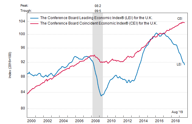 Результаты исследований, опубликованные Conference Board, показали: по итогам августа ведущий экономический индекс (LEI) для Британии упал на 0,5 процента, и составил 91,3 пункта (2016=100). Напомним, индекс зафиксировал снижение на 0,2 процента в июле и падение на 0,5 процента в июне. В течение шести месяцев (с февраля 2019 по август 2019 года) показатель упал на 3,0 процента после снижения на 2,9 процента за предыдущий шестимесячный период (с января 2019 года по июль 2019 года).