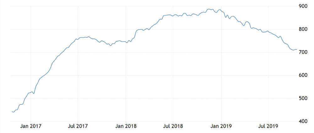Отчет нефтесервисной компании Baker Hughes показал: с 12 по 18 октября количество активных буровых установок по добыче нефти в США выросло на 1 единицу, и составило 713 единиц. Это было второе повышение подряд. Напомним, годом ранее количество установок составляло 873 штуки. Количество установок по добыче газа упало на 6 штук, до 137 единиц. Общее число буровых установок (газовых, нефтяных и прочих) снизилось на 5 штук, составив 851 штуку.