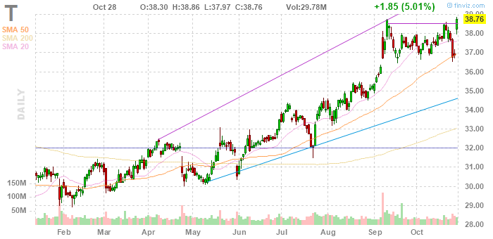 На текущий момент акции T котируются по $38.76 (+5.01%).