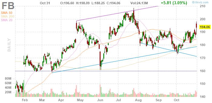На текущий момент акции FB котируются по $194.06 (+3.09%).