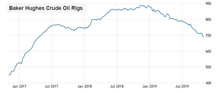 Отчет нефтесервисной компании Baker Hughes показал: с 26 октября - 1 ноября количество активных буровых установок по добыче нефти в США упало на 5 единиц, и составило 691 единицу. Это было второе снижение подряд. Напомним, годом ранее количество установок составляло 874 штук. Количество установок по добыче газа снизилось на 3 штуки, до 130 единиц. Общее число буровых установок (газовых, нефтяных и прочих) сократилось на 8 штук, составив 822 штуки.