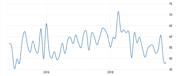 Согласно отчету, в октябре индекс деловой активности упал до 48,2 пункта с 48,7 пункта в сентябре. Экономисты ожидали, что показатель вырастет до 54,4 пункта. Напомним, индикатор показывает уровень деловой активности промышленного сектора. Более чем 150 менеджерам из разных регионов и отраслей предлагается оценить уровень закупок по сравнению с предыдущим месяцем (выше, ниже или на том же уровне). Значение выше 50 означает увеличение закупок, а значение ниже 50 свидетельствует об уменьшении их объема. В отчете сообщалось, что индекс оставался ниже уровня 50 второй месяц подряд, что наблюдалось впервые с начала марта 2015 года..