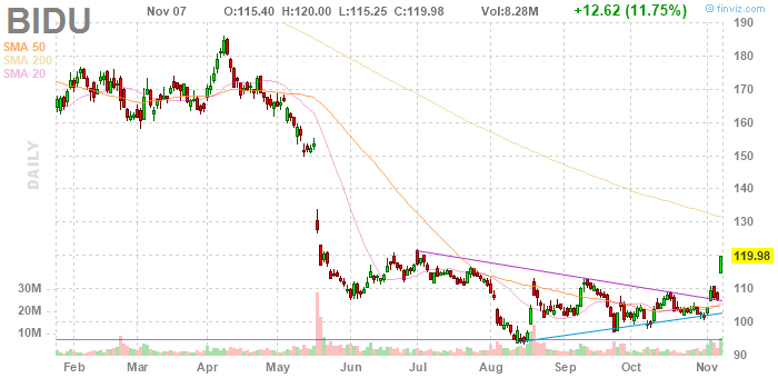 На текущий момент акции BIDU котируются по $119.98 (+11.75%).