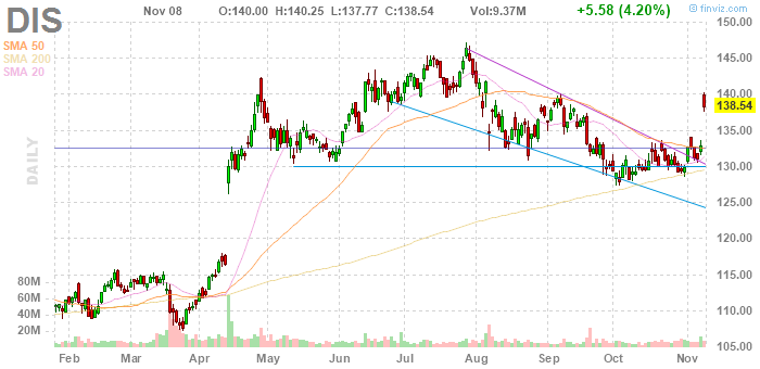 На текущий момент акции DIS котируются по $138.54 (+4.20%).