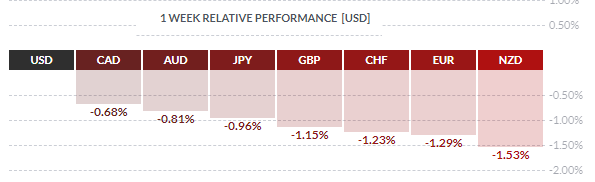 По итогам недели все основные валюты продемонстрировали снижение. Наибольший спад по отношению к доллару США показал новозеландский доллар (-1,53%). Меньшее падение зафиксировали евро (-1,29%), швейцарский франк (-1,23%), британский фунт (-1,15%), японская иена (-0,96%), австралийский доллар (-0,81%) и канадский доллар (-0,68%).
