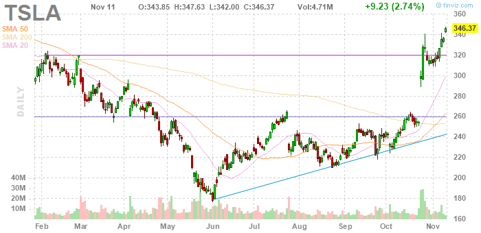 На текущий момент акции TSLA котируются по $346.37 (+2.74%).