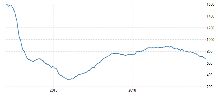 Отчет нефтесервисной компании Baker Hughes показал: с 9 по 15 ноября количество активных буровых установок по добыче нефти в США упало на 10 единиц, и составило 674 единицы. Это было четвертое снижение подряд. Напомним, годом ранее количество установок составляло 888 штук. Количество установок по добыче газа снизилось на 1 штуку, до 129 единиц. Общее число буровых установок (газовых, нефтяных и прочих) сократилось на 11 штук, составив 806 штук.