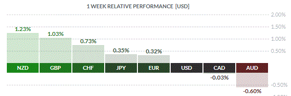 По итогам недели почти все основные валюты продемонстрировали повышение. Наибольший прирост по отношению к доллару США показал новозеландский доллар (+1,23%). Меньшее повышение зафиксировали британский фунт (+1,03%), швейцарский франк (+0,73%), японская иена (+0,35%) и евро (+0,32%). Падение зафиксировали только канадский доллар (-0,03%) и австралийский доллар (-0,60%).