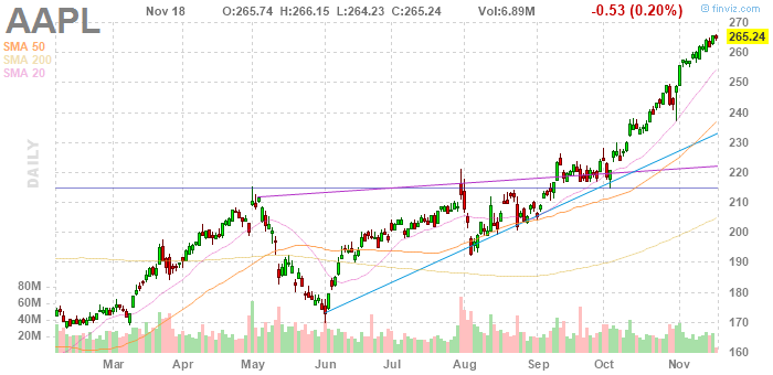 На текущий момент акции AAPL котируются по $265.24 (-0.20%).