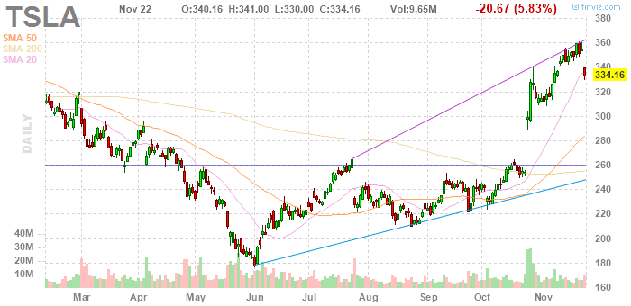 На текущий момент акции TSLA котируются по $334.16 (-5.83%).