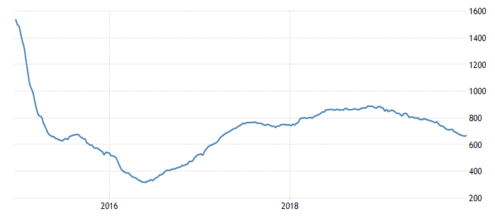Отчет нефтесервисной компании Baker Hughes показал: с 7 по 13 декабря количество активных буровых установок по добыче нефти в США выросло на 4 единицы, и составило 667 штук. Это было первое повышение за 8 недель. Напомним, годом ранее количество установок составляло 873 штук. Количество установок по добыче газа упало на 4 штуки, и составило 129 единиц. Общее число буровых установок (газовых, нефтяных и прочих) не изменилось, и составило 799 штук.