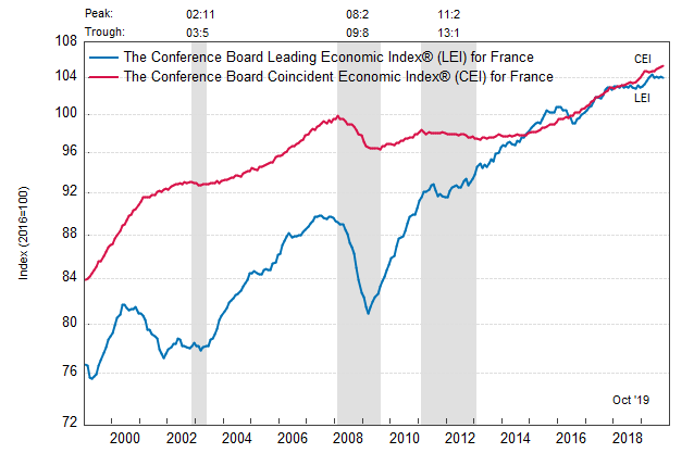 Результаты исследований, опубликованные Conference Board, показали: по итогам октября ведущий экономический индекс (LEI) для Франции снизился на 0,2 процента, и составил 104,0 пункта (2016=100). Напомним, индекс зафиксировал повышение на 0,2 процента в сентябре и падение на 0,1 процента в августе. В течение шести месяцев (с апреля 2019 по октябрь 2019 года) показатель не изменился после повышения на 0,5 процента за предыдущий шестимесячный период (с марта 2019 года по сентябрь 2019 года).