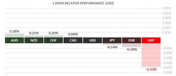 По итогам недели основные валюты продемонстрировали смешанную динамику. Повышение по отношению к доллару США показали австралийский доллар (+0,38%), новозеландский доллар (+0,21%), швейцарский франк (+0,20%) и канадский доллар (+0,08%). Снижение зафиксировали британский фунт (-2,43%), евро (-0,38%) и японская иена (-0,14%),
