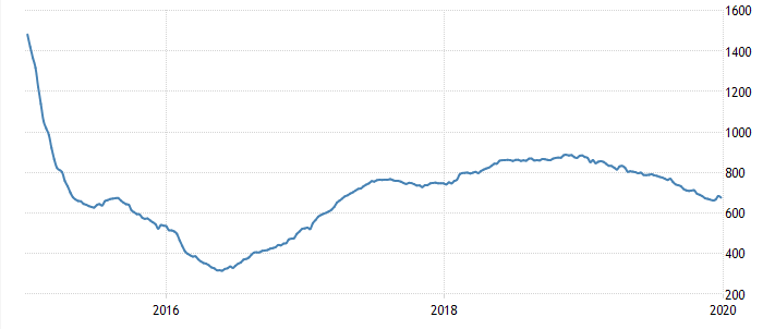 Отчет нефтесервисной компании Baker Hughes показал: с 21 по 27 декабря количество активных буровых установок по добыче нефти в США упало на 8 единиц, и составило 677 штук. Это было первое снижение за последние три недели. Напомним, годом ранее количество установок составляло 885 штук. Количество установок по добыче газа не изменилось, и составило 125 единиц. Общее число буровых установок (газовых, нефтяных и прочих) уменьшилось на 8 штук, и составило 805 штук (по сравнению с 1083 единицы годом ранее)..