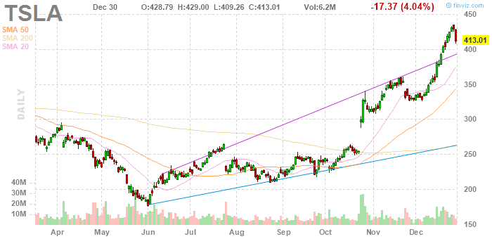 На текущий момент акции TSLA котируются по $413.01 (-4.04%).