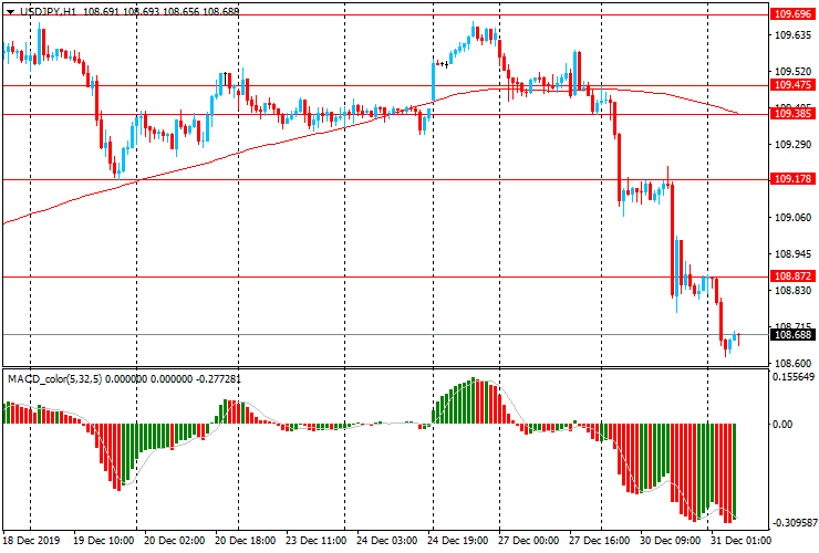 Вчера USD/JPY резко снизилась с Y109.50 до Y108.75 и закрыла сессию около Y108.90. Сегодня пара продолжила снижаться и опустилась к Y108.60. USD/JPY опустилась ниже уровня скользящей средней МА (200) Н1 (Y109.40), и на четырехчасовом графике торгуется ниже МА (200) H4 (Y109.00), указывая на вероятный переход пары под контроль медведей. В этой ситуации стоит начать придерживаться южного направления в торговле, и искать точки входа на продажу.