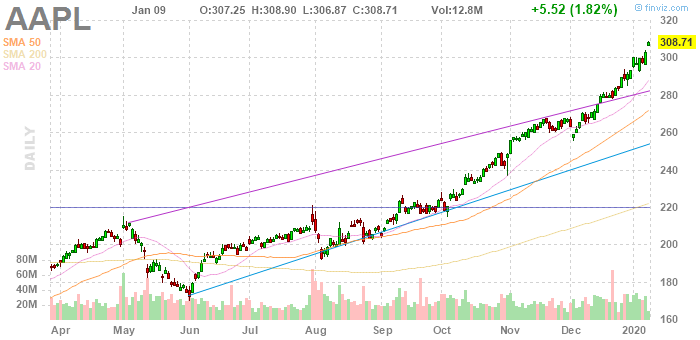 Ранее на этой неделе аналитик Needham Лора Мартин (Laura Martin) понизила рейтинг акций Apple до уровня Buy со Strong Buy, указав на их сильный рост в 2019 году, в результате которого стоимость акций AAPL превысила ее прогноз целевой цены в $280. В то же время она повысила целевую стоимость на ближайшие 12 месяцев для акции Apple до $350.