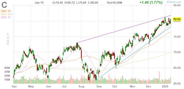 Согласно обнародованному отчету, прибыль компании Citigroup (C) по итогам четвертого квартала 2019 финансового года (ФГ) достигла $1.90 в расчете на одну акцию (против $1.64 в четвертом квартале 2018 ФГ), что оказалось выше среднего прогноза аналитиков на уровне $1.83.