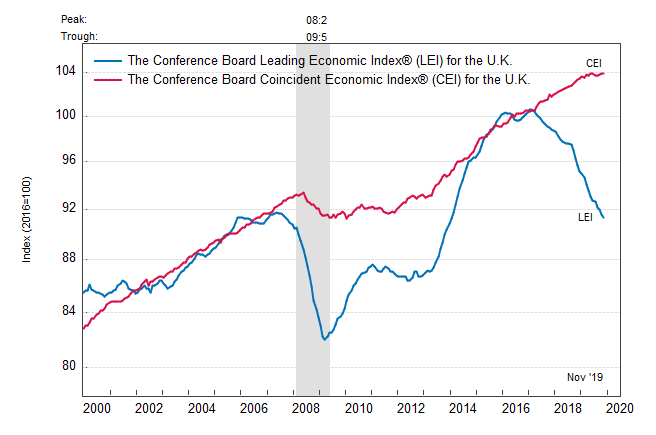 Результаты исследований, опубликованные Conference Board, показали: по итогам ноября ведущий экономический индекс (LEI) для Британии снизился на 0,2 процента, и составил 91,4 пункта (2016=100). Напомним, индекс зафиксировал падение на 0,4 процента в октябре и снижение на 0,2 процента в сентябре. В течение шести месяцев (с мая 2019 по ноябрь 2019 года) показатель упал на 1,8 процента после снижения на 2,1 процента за предыдущий шестимесячный период (с апреля 2019 года по октябрь 2019 года).