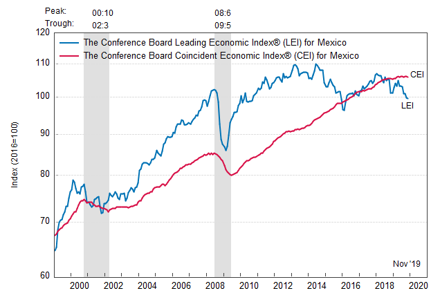 Результаты исследований, опубликованные Conference Board, показали: по итогам ноября ведущий экономический индекс (LEI) для Мексики снизился на 0,2 процента, и составил 99,7 пункта (2016=100). Напомним, индекс зафиксировал падение на 1,2 процента в октябре и нулевое изменение в сентябре. В течение шести месяцев (с мая 2019 по ноябрь 2019 года) показатель упал на 3,5 процента после снижения на 4,7 процента за предыдущий шестимесячный период (с апреля 2019 года по октябрь 2019 года).