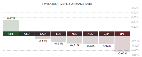 По итогам недели почти все основные валюты продемонстрировали снижение. Наибольшее падение по отношению к доллару США показала японская иена (-0,65%). Меньшее снижение зафиксировали британский фунт (-0,34%), австралийский доллар (-0,33%), новозеландский доллар (-0,31%), евро (-0,23%) и канадский доллар (-0,15%). Вырос только швейцарский франк (+0,47%).
