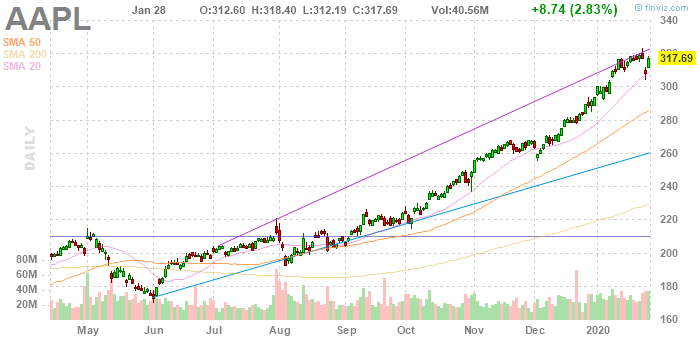 Согласно обнародованному отчету, прибыль компании Apple (AAPL) по итогам первого квартала 2020 финансового года (ФГ) достигла $4.99 в расчете на одну акцию (против $4.18 на одну акцию в первом квартале 2019 ФГ), что оказалось выше среднего прогноза аналитиков на уровне $4.54 на одну акцию.