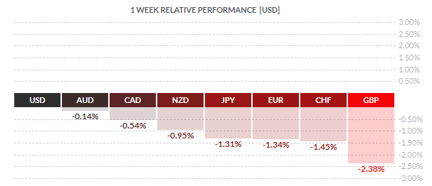 По итогам недели все основные валюты продемонстрировали снижение. Наибольший спад по отношению к доллару США показал британский фунт (-2,38%). Меньшее падение зафиксировали швейцарский франк (-1,45%), евро (-1,34%), японская иена (-1,31%), новозеландский доллар (-0,95%), канадский доллар (-0,54%) и австралийский доллар (-0,14%).