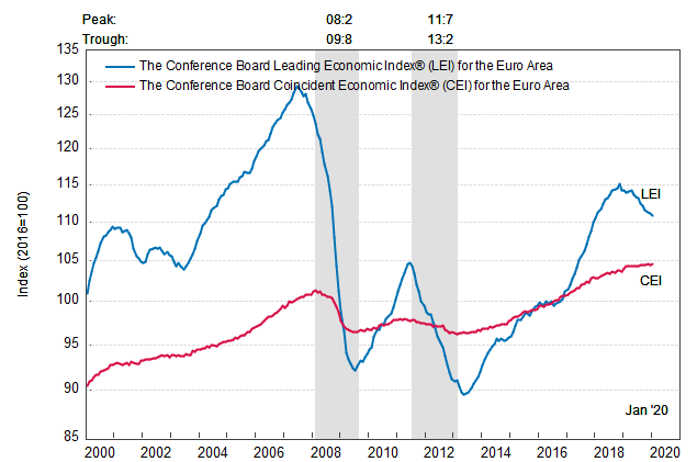 Результаты исследований, опубликованные Conference Board, показали: по итогам января ведущий экономический индекс (LEI) для еврозоны снизился на 0,2 процента, и составил 110,9 пункта (2016=100). Напомним, индекс зафиксировал падение на 0,2 процента в декабре и снижение на 0,3 процента в ноябре. В течение шести месяцев (с июля 2019 по январь 2020 года) показатель упал на 2,0 процента после аналогичного снижения за предыдущий шестимесячный период (с июня 2019 года по декабрь 2019 года).