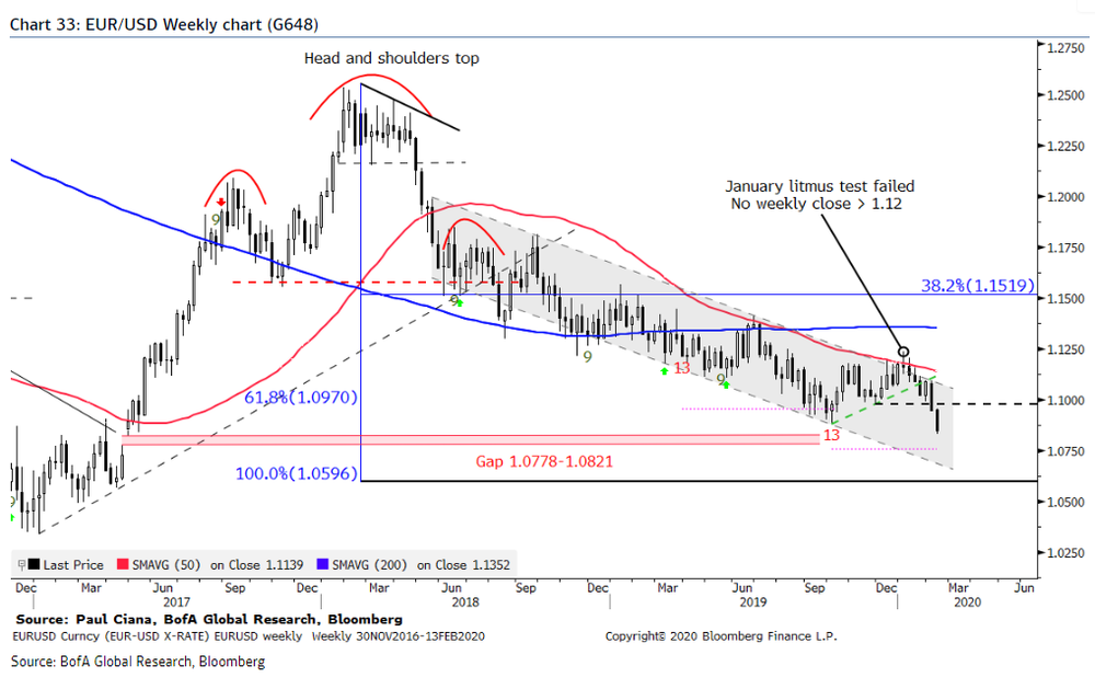 "EUR/USD: медвежий канал и нисходящий тренд остаются. В нашем отчете FICC Technicals за 2020 год мы озвучили медвежий настрой по EUR/USD. В конце декабря и январе ценовое движение подвергло наш взгляд риску из-за некоторых технических прорывов и сигналов. Но EUR/USD так и не подтвердила эти сигналы, пройдя январский "лакмусовый тест". Наоборот, она возобновила свое падение В краткосрочной перспективе это снижение перепродано и пара может отскочить примерно на 1,10. Однако среднесрочные технические данные предполагают, что ценовой гэп из-за выборов во Франции будет закрыт. Также возможно тестирование 35-летней трендовой линии в области 1.05".