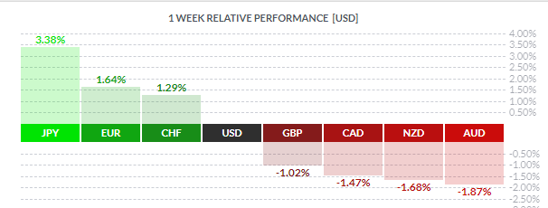 По итогам недели основные валюты продемонстрировали смешанную динамику. Падение по отношению к доллару США показали австралийский доллар (-1,87%), новозеландский доллар (-1,68%), канадский доллар (-1,47%) и британский фунт (-1,02%). Повышение зафиксировали японская иена (+3,38%), евро (+1,64%) и швейцарский франк (+1,29%).