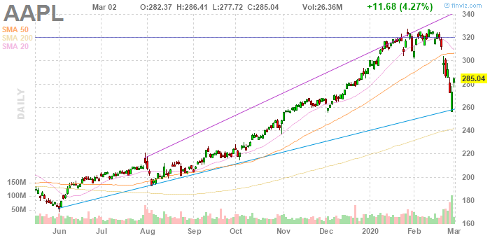 На текущий момент акции AAPL котируются по $285.04 (+4.27%).