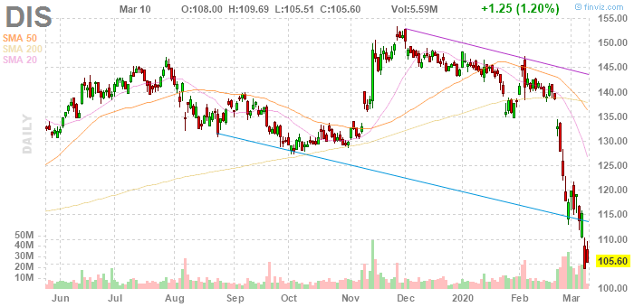 Акции Disney (DIS) растеряли весь свой рост за прошедший год, поскольку инвесторы взвешивают влияние вспышки коронавируса на результаты следующих нескольких кварталов.