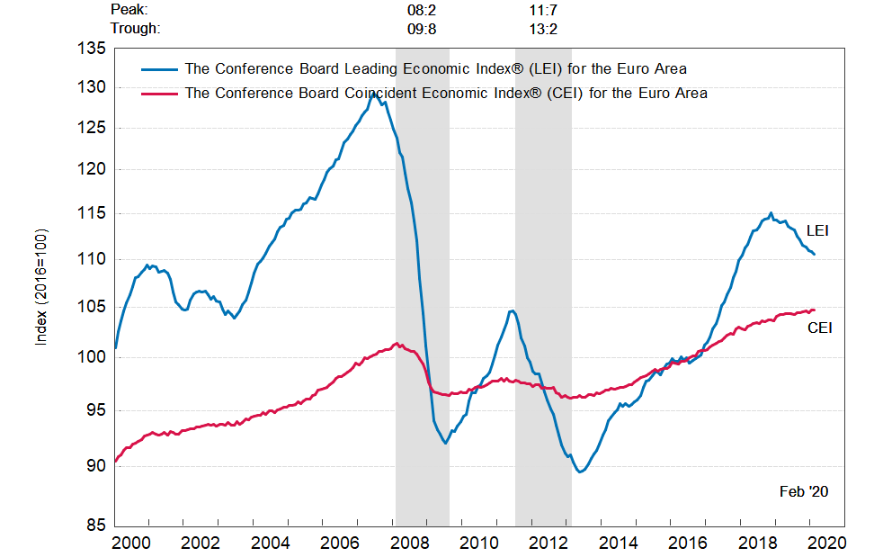 Результаты исследований, опубликованные Conference Board, показали: по итогам февраля ведущий экономический индекс (LEI) для еврозоны упал на 0,3 процента, и составил 110,6 пункта (2016=100). Напомним, индекс зафиксировал снижение на 0,1 процента в январе и падение на 0,4 процента в декабре. В течение шести месяцев (с августа 2019 по февраль 2020 года) показатель упал на 1,7 процента после снижения на 2,0 процента за предыдущий шестимесячный период (с июля 2019 года по январь 2020 года).