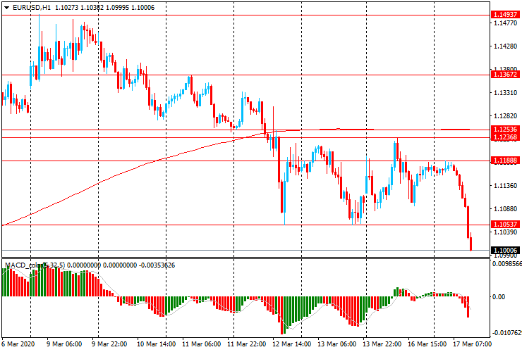 ЕUR/USD: пара торгуется со снижением достигнув минимального значения с начала марта. Пара снизилась с $1.1190 до $1.1015