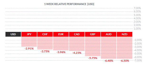 По итогам недели все основные валюты продемонстрировали снижение. Наибольший спад по отношению к доллару США показали новозеландский доллар (-6,50%) и австралийский доллар (-6,48%). Меньшее падение зафиксировали британский фунт (-5,75%), канадский доллар (-4,23%), евро (-3,96%), швейцарский франк (-3,75%) и японская иена (-2,91%).