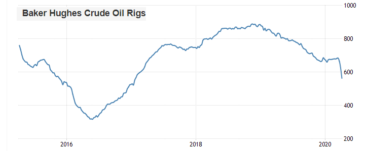 Отчет нефтесервисной компании Baker Hughes показал: с 28 марта по 3 апреля количество активных буровых установок по добыче нефти в США упало на 62 единицы, и составило 562 штуки. Напомним, годом ранее количество установок составляло 831 штуку. Количество установок по добыче газа снизилось на 2 штуки, и составило 100 единиц. Общее число буровых установок (газовых, нефтяных и прочих) сократилось на 64 штуки, и составило 664 штуки (по сравнению с 1025 единиц годом ранее).