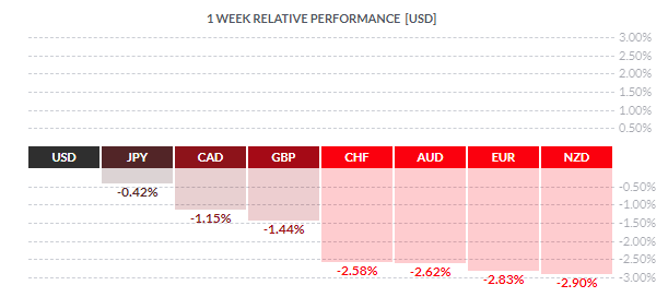 По итогам недели все основные валюты продемонстрировали снижение. Наибольший спад по отношению к доллару США показал новозеландский доллар (-2,90%). Меньшее падение зафиксировали евро (-2,83%), австралийский доллар (-2,62%), швейцарский франк (-2,58%), британский фунт (-1,44%), канадский доллар (-1,15%) и японская иена (-0,42%).