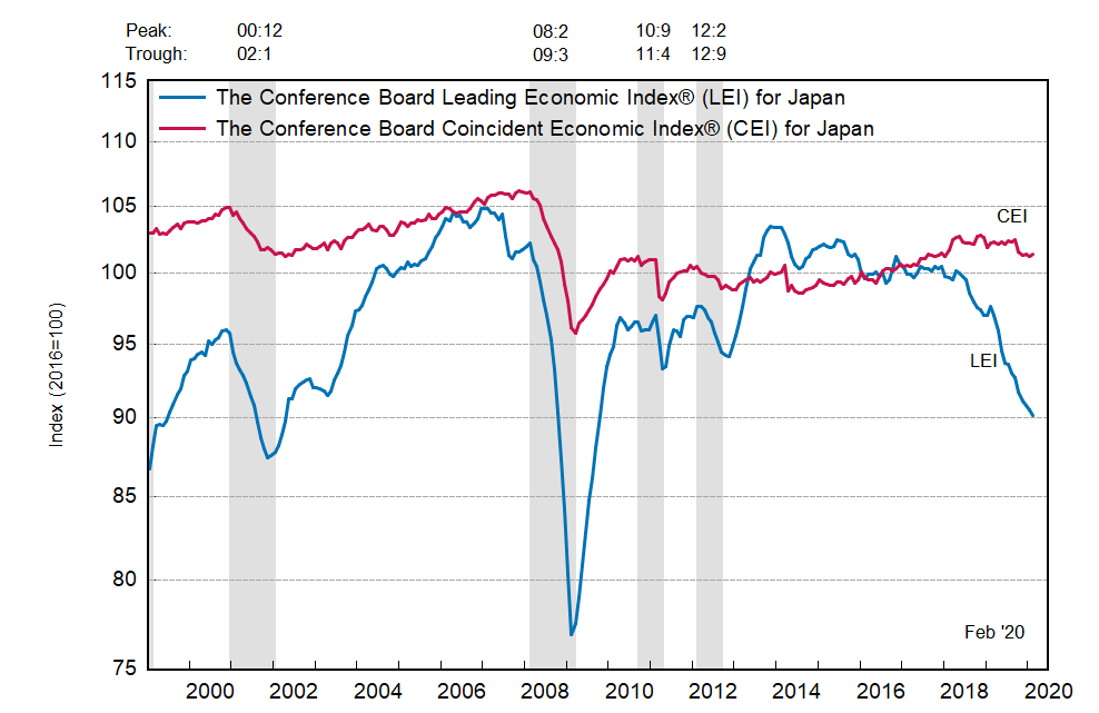 Результаты исследований, опубликованные Conference Board, показали: по итогам февраля ведущий экономический индекс (LEI) для Японии упал на 0,3 процента, и составил 90,2 пункта (2016=100). Напомним, индекс зафиксировал снижение по 0,3 процента в январе и декабре. В течение шести месяцев (с августа 2019 по февраль 2020 года) показатель упал на 3,0 процента после снижения на 3,3 процента за предыдущий шестимесячный период (с июля 2019 года по январь 2020 года).