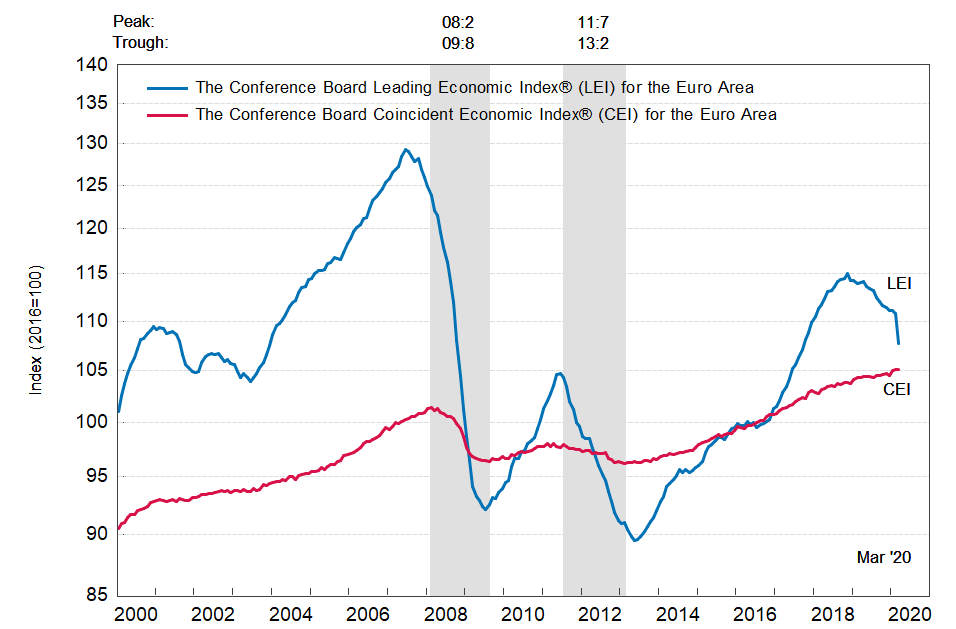 Результаты исследований, опубликованные Conference Board, показали: по итогам марта ведущий экономический индекс (LEI) для еврозоны упал на 2,8 процента, и составил 107,7 пункта (2016=100). Напомним, индекс зафиксировал снижение на 0,2 процента в феврале и нулевое изменение в январе. В течение шести месяцев (с сентября 2019 по март 2020 года) показатель упал на 3,9 процента после снижения на 1,5 процента за предыдущий шестимесячный период (с августа 2019 года по февраль 2020 года).