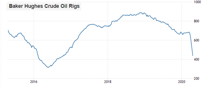 Отчет нефтесервисной компании Baker Hughes показал: с 11 по 17 апреля количество активных буровых установок по добыче нефти в США упало на 66 единиц, и составило 438 штуки. Напомним, годом ранее количество установок составляло 825 штук. Количество установок по добыче газа снизилось на 7 штук, и составило 89 единиц. Общее число буровых установок (газовых, нефтяных и прочих) сократилось на 73 штуки, и составило 529 штук (по сравнению с 1012 единиц годом ранее).