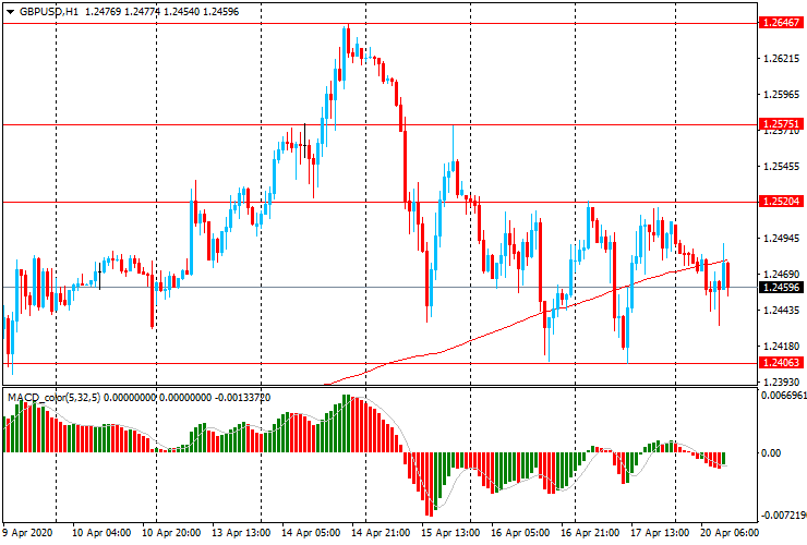 GBP/USD: пара торгуется в основном со снижением с $1.2505 до $1.2435, после роста в конце сессии пятницы с $1.2405 до $1.2515. На момент написания статьи пара торгуется около $1.2455.