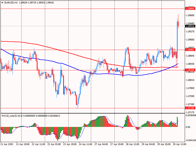 Пара EURUSD резко выросла, и приблизилась к максимуму 15 марта, что было вызвано обвалом доллара США, коррекцией позиций в конце месяца, и техническими факторами. Сейчас EURUSD торгуется на $1.0942