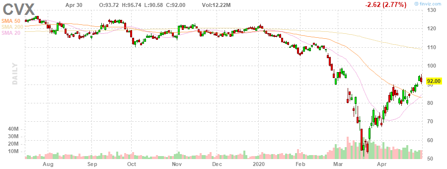 Согласно обнародованному отчету, прибыль компании Chevron (CVX) по итогам первого квартала 2020 финансового года (ФГ) достигла $1.93 в расчете на одну акцию (против $1.39 на одну акцию в первом квартале 2019 ФГ), что оказалось выше среднего прогноза аналитиков на уровне $0.67 на одну акцию.