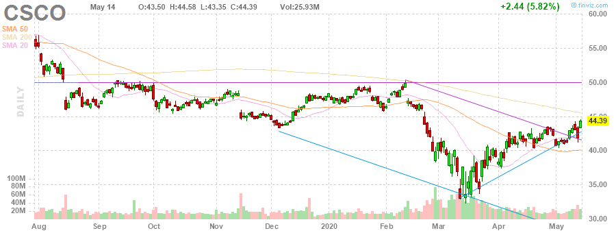 На текущий момент акции CSCO котируются по $44.39 (+5.82%).